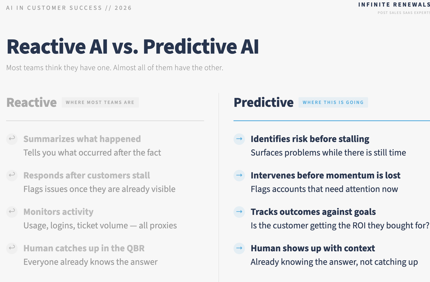 Predictive AI works differently. Instead of waiting for a problem to appear, it identifies early signals that indicate an account may be drifting away from its intended outcome.